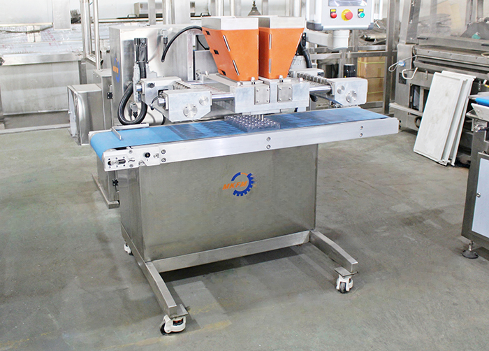 Introduction: The MOS one-shot depositor is used to produce chocolate bonbons and standard chocolate bars. The depositing head is raised and lowered by a servo motor. The depositing piston and conveyor belt are servo-driven. Equipped with a PLC automatic control system, it can store multiple recipes and processes, allowing for versatile control adjustments to produce a wide variety of product types. It can be used to produce large-scale chocolate bonbons and long bars. It offers diverse functions, high casting accuracy, easy cleaning, and simple installation and maintenance.