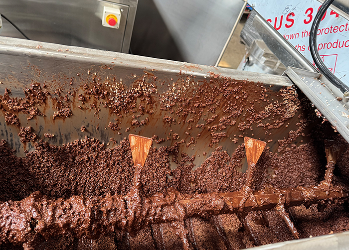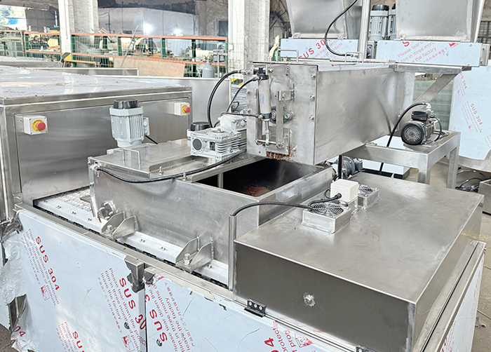 Introduction: The MCM Crispy Rice Depositor is specialized for large-scale production of oatmeal chocolate and crispy rice chocolate, modularly compatible with other depositing equipment. The machine protects dry material feeding, chocolate feeding, continuous mixing, and forming processes.